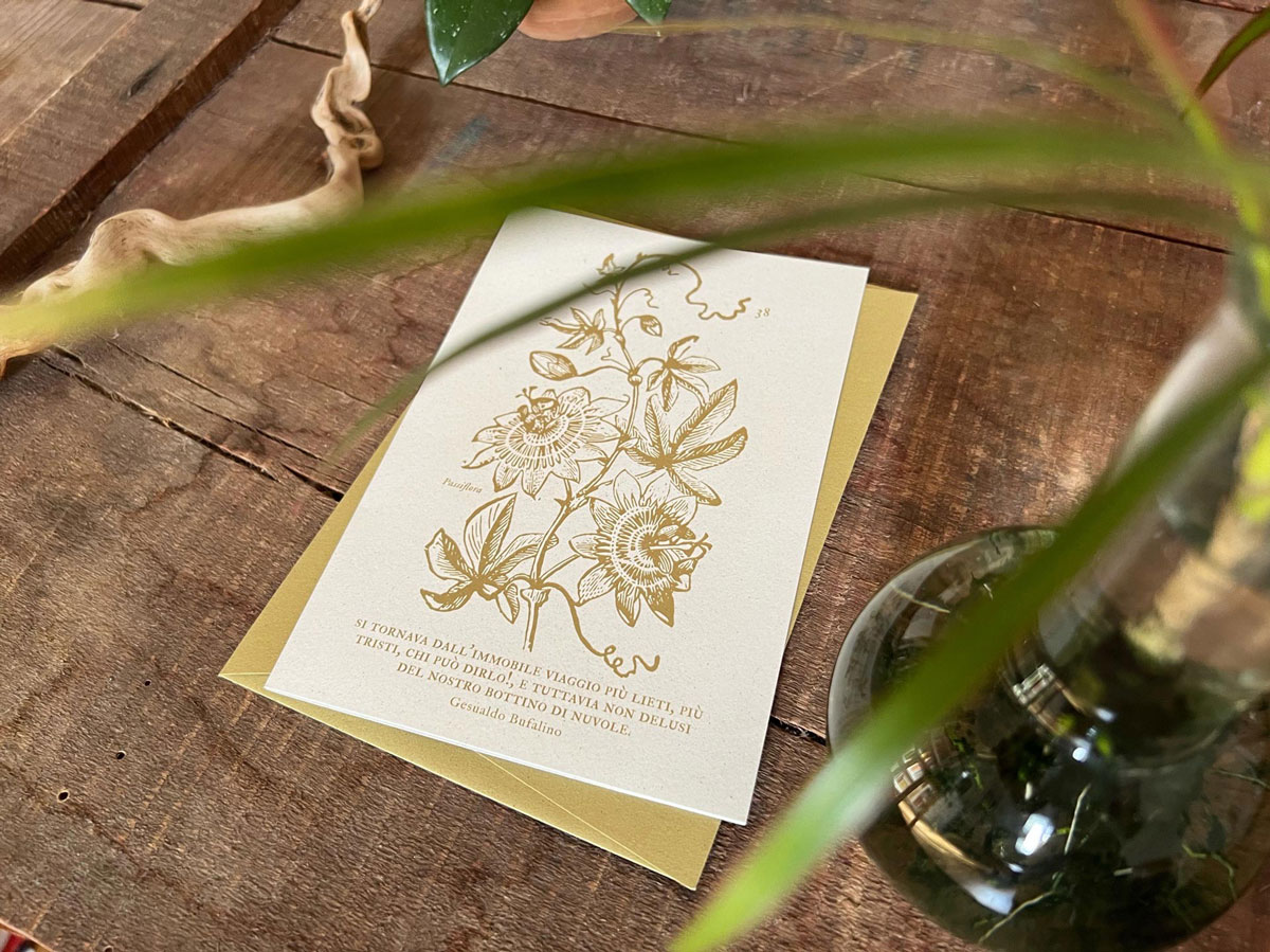 Biglietto di auguri con illustrazione botanica, realizzato su carta FSC® composta con sottoprodotti di lavorazioni agro-industriali (mais per il biglietto + olive per la busta).