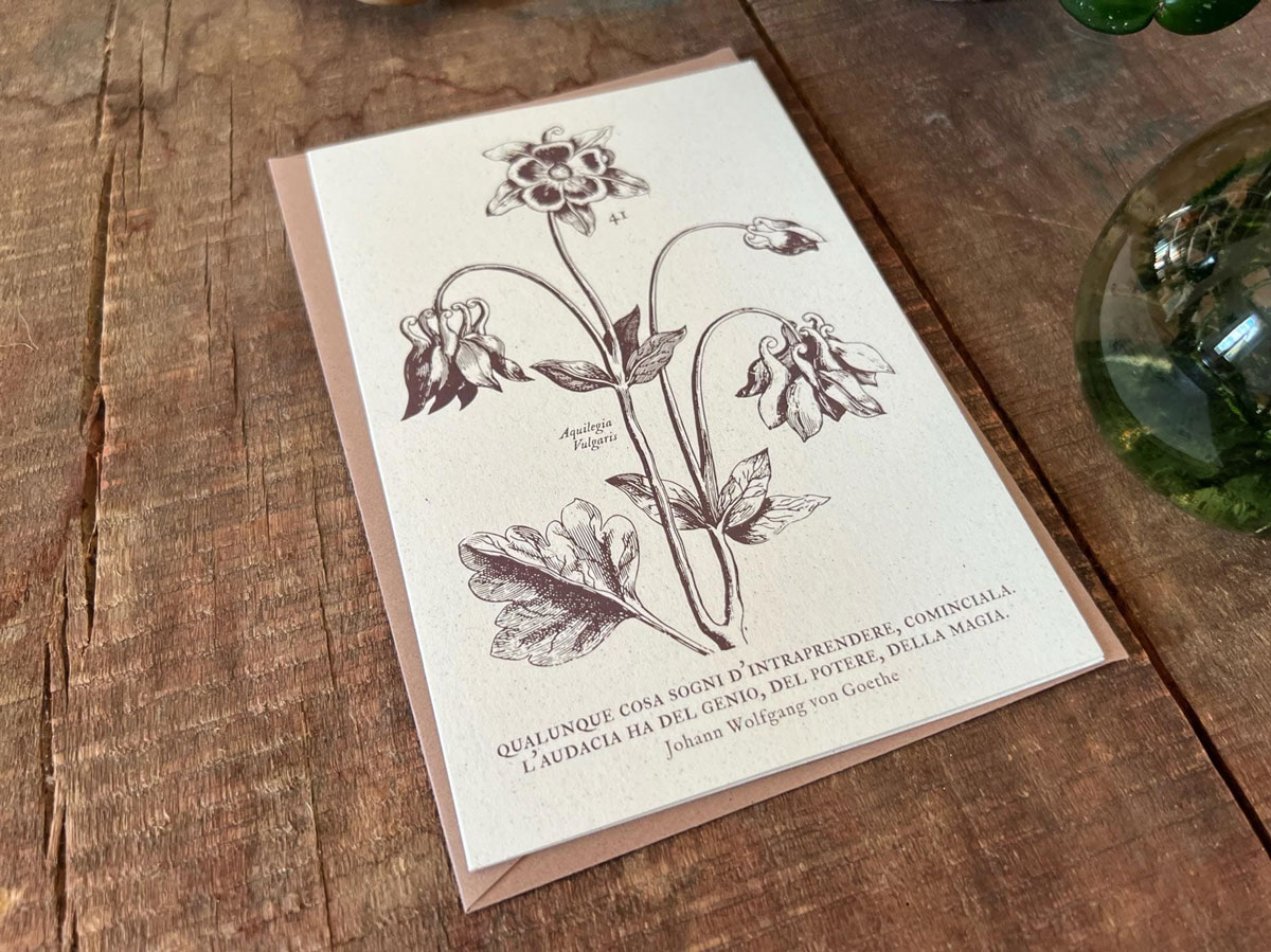 Biglietto di auguri con illustrazione botanica, realizzato su carta FSC® composta con sottoprodotti di lavorazioni agro-industriali (mais per il biglietto + mandorle per la busta).